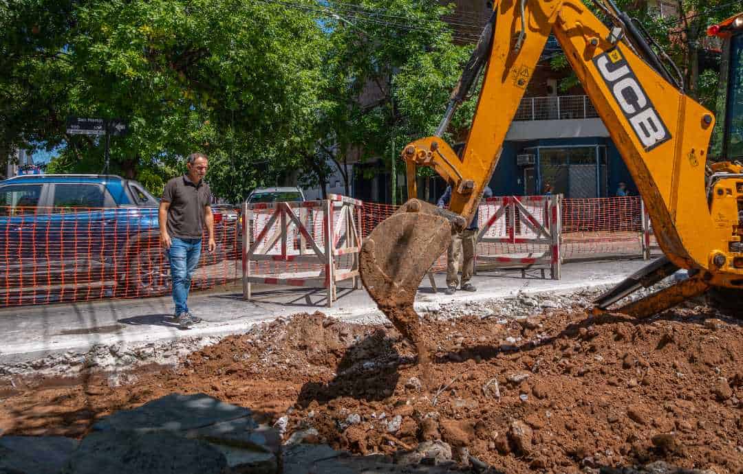 Y, esta semana, el intendente Sebastián Abella supervisó las tareas que se desarrollan sobre San Martín, esquina Estrada, donde maquinaria de gran porte se encuentra retirando el paño de hormigón dañado para su posterior reparación.